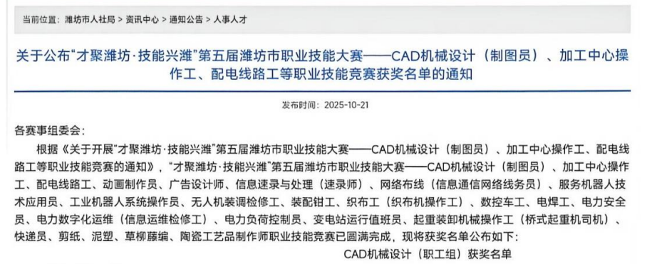 近日,“才聚潍坊·技能兴潍”第五届潍坊市职业技能大赛——CAD机械设计(制图员)、加工中心操作工、配电线路工等职业技能竞赛比赛圆满落幕,管理学院教师凭借出色表现大放异彩,一举斩获一等奖与二等奖,为学院赢得了极高荣誉。