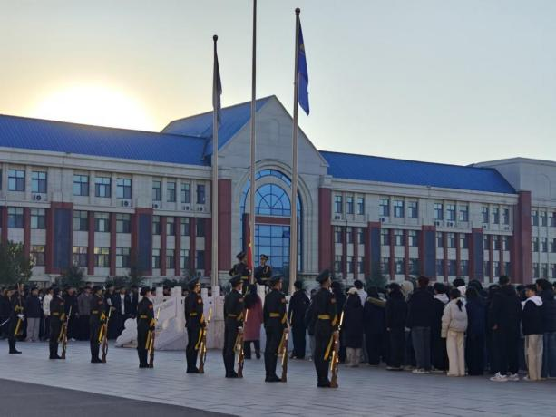 上午7时,国旗护卫队迈着铿锵有力的步伐,护卫着五星红旗来到国旗杆下。伴随雄壮激昂的《义勇军进行曲》,鲜艳的五星红旗冉冉升起,迎风飘扬。全体人员面向国旗行注目礼,齐声高唱国歌,抒发对伟大祖国的无限热爱与崇高敬意。