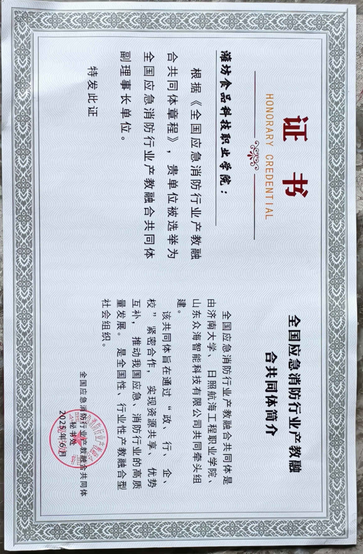 全国应急消防行业产教融合共同体由中国消防协会指导,由日照航海工程职业学院联合济南大学、山东众海智能科技有限公司及行业龙头发起成立,全国200余家高校、科研机构、行业组织和企业参与组建,是日照市首个全国性产教融合平台。旨在通过“政、行、企、校”紧密协同,打造集人才培养、技术研发、成果转化、科普教育于一体的综合性服务平台。