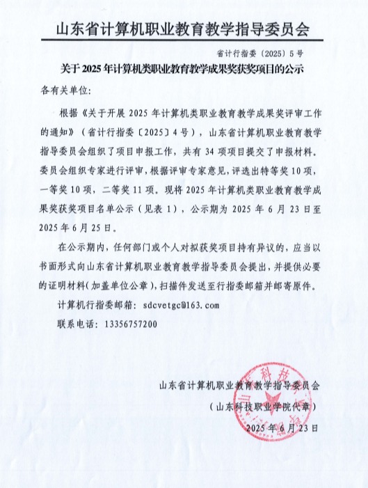 近日,山东省计算机职业教育教学指导委员会公布了2025年计算机类职业教育教学成果奖获奖名单,我校荣获一等奖1项、二等奖1项。
