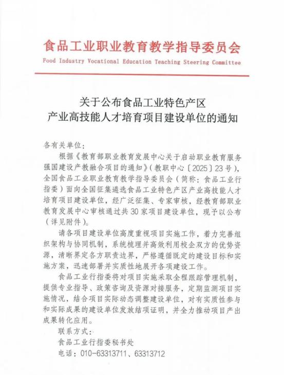 近日,全国食品工业职业教育教学指导委员会印发了《关于公布食品工业特色产区产业高技能人才培育项目建设单位的通知》,我校成功入选食品工业特色产区产业高技能人才培育项目建设单位名单。这是学校在食品类高技能人才培养领域获得的又一重要认可,标志着学校服务区域食品产业发展的能力迈上新台阶,也将为传统优势食品产区和地方特色食品产业高质量发展注入强劲人才动能。