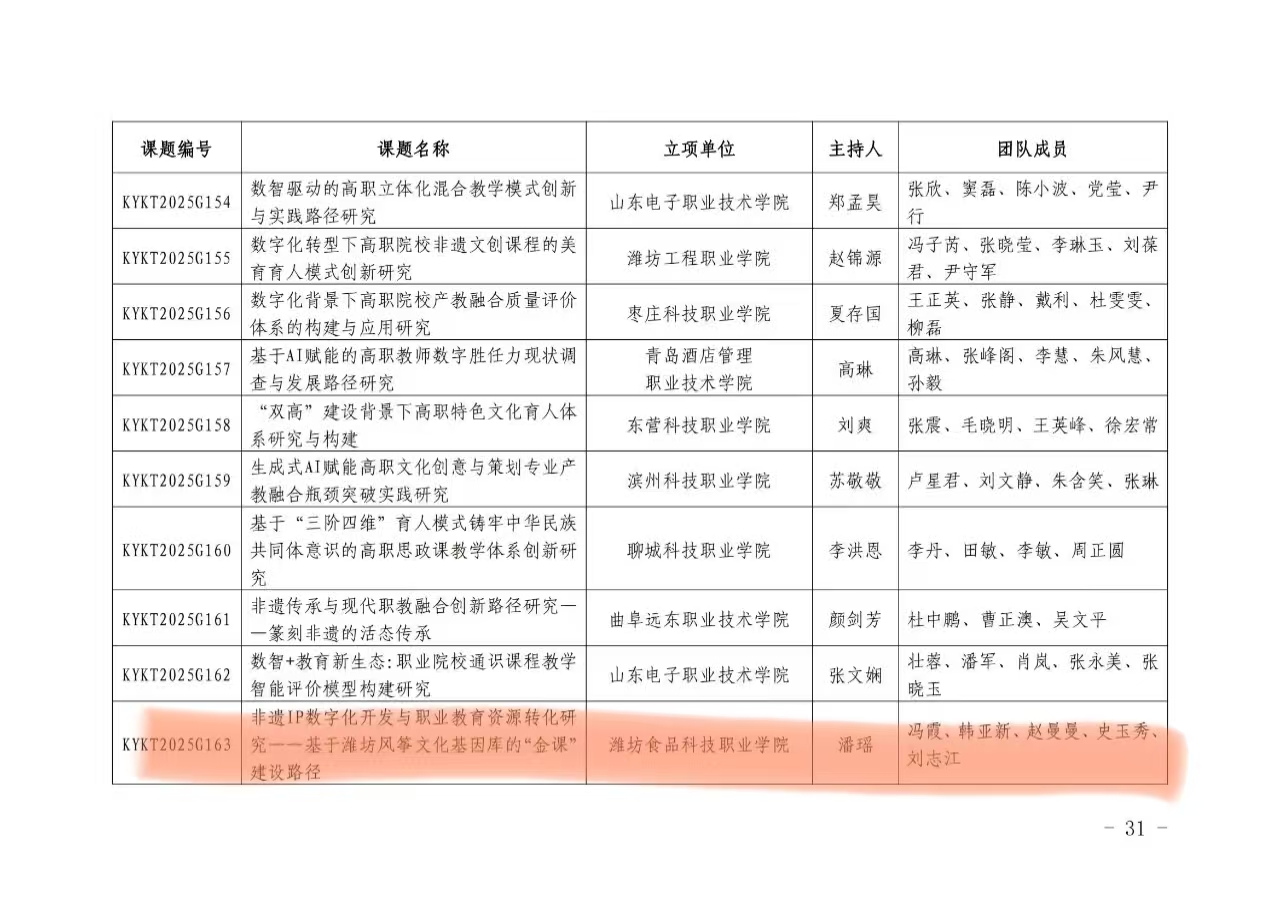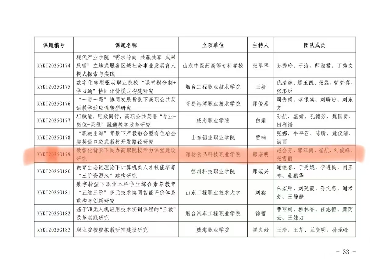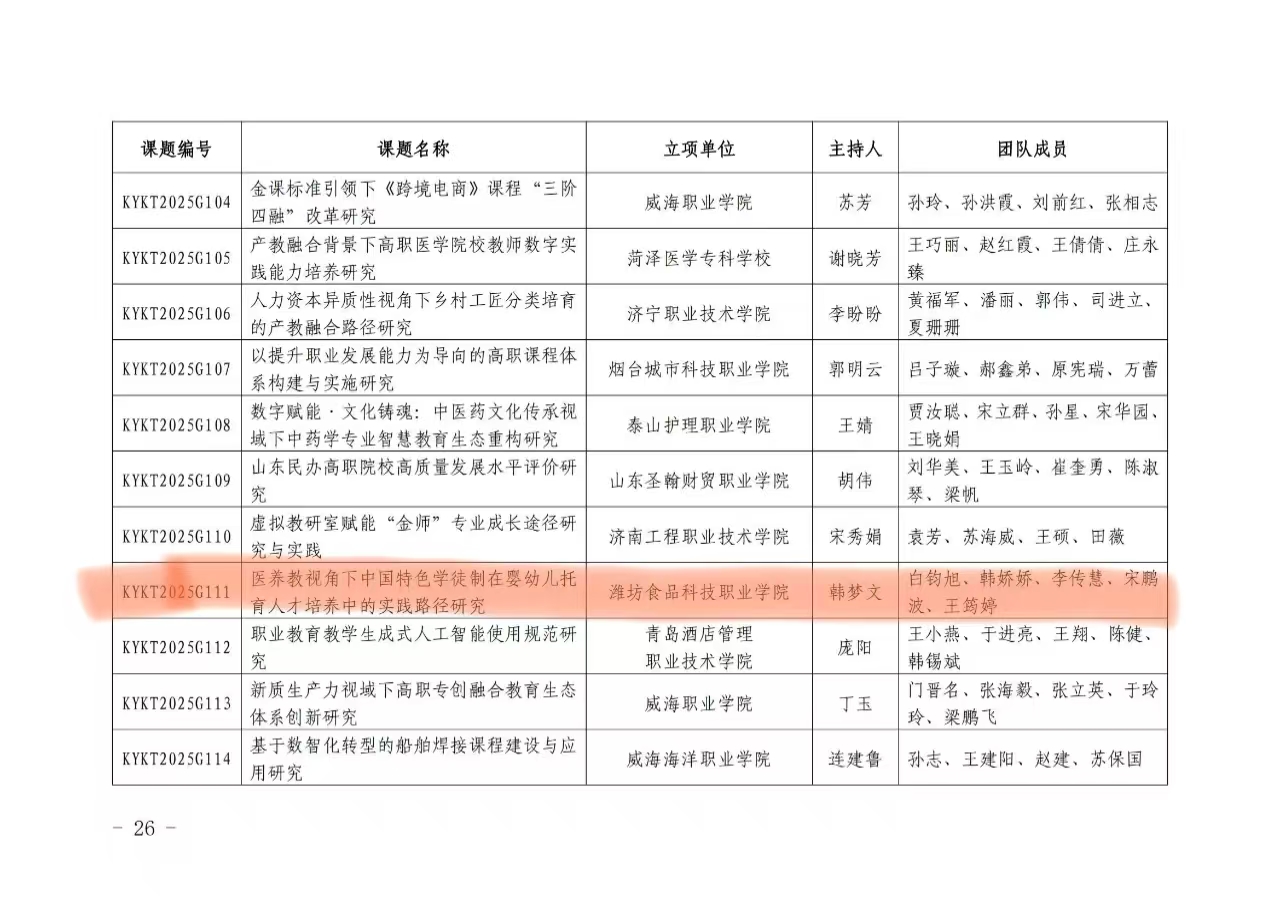 近日,山东省职业技术教育学会公布了2025年度职业教育科研课题立项名单。我校韩梦文教师团队申报的《医养教视角下中国特色学徒制在婴幼儿托育人才培养中的实践路径研究》课题、潘瑶教师团队申报的《非遗IP数字化开发与职业教育资源转化研究——基于潍坊风筝文化基因库的“金课”建设路径》课题及郭宗明教师团队申报的《数智化背景下民办高职院校活力课堂建设研究》课题成功获得立项。