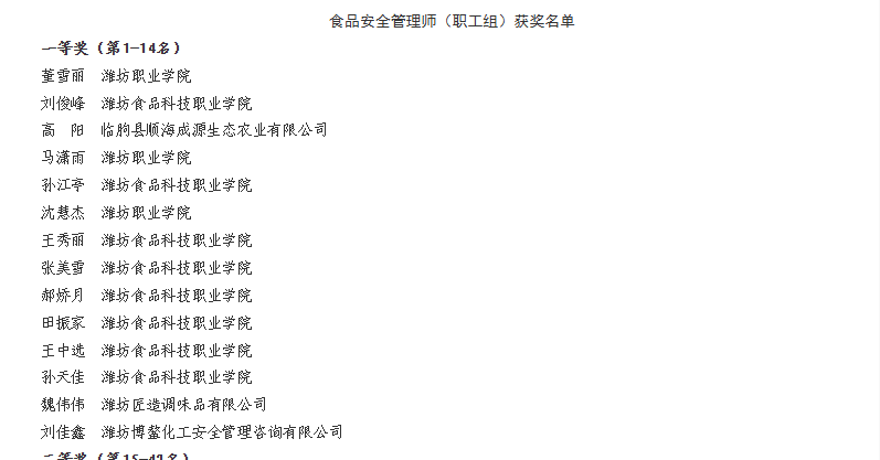 近日,“才聚潍坊・技能兴潍”第五届潍坊市职业技能大赛——健康管理师、食品安全管理师、公共营养师等技能竞赛公布获奖名单。我校食药学院教师团队凭借扎实的专业功底在多个竞赛项目中脱颖而出,斩获一等奖在内的多个奖项。